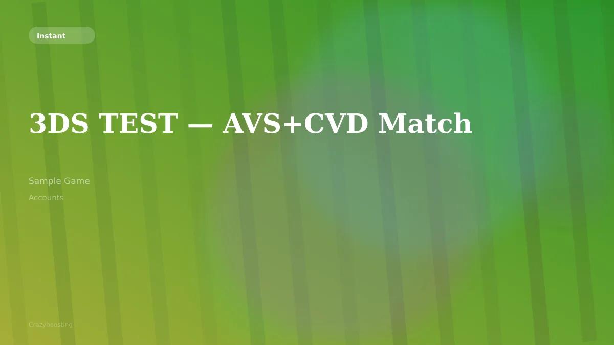 Sample Game·Accounts3DS TEST — AVS+CVD MatchInstant$20.20per serviceInstant deliveryDescription$20.20 — 3DS frictionless + AVS full match + CVD match Hidden test listing for Moneris 3DS combo testing. Use the appropriate test card from developer.moneris.com. Amount: $20.20 USD.SellerTest Seller★ 5.0(1 reviews)Verified sellerFast deliveryService details (optional)Add to cartBuy nowChecking account…